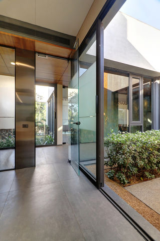 A unified linear office building that appears floating above the ground is conceived to make its presence felt amidst the large industrial sheds. The entrance has been positioned carefully along the linear side of the building in order to segregate the variety of workspaces as required. Each of these spaces is connected by a central corridor for efficient day-to-day work. The strategy to bring in light on both portions is different in order to maximize the light intake for better working conditions. At individual cabins, there are staggered courtyards that act as spill-out zones as well, while for workstations natural light is taken through the skylight. Elements like peripheral beams and columns are tapered, complementing each other and further accentuating the linear form.